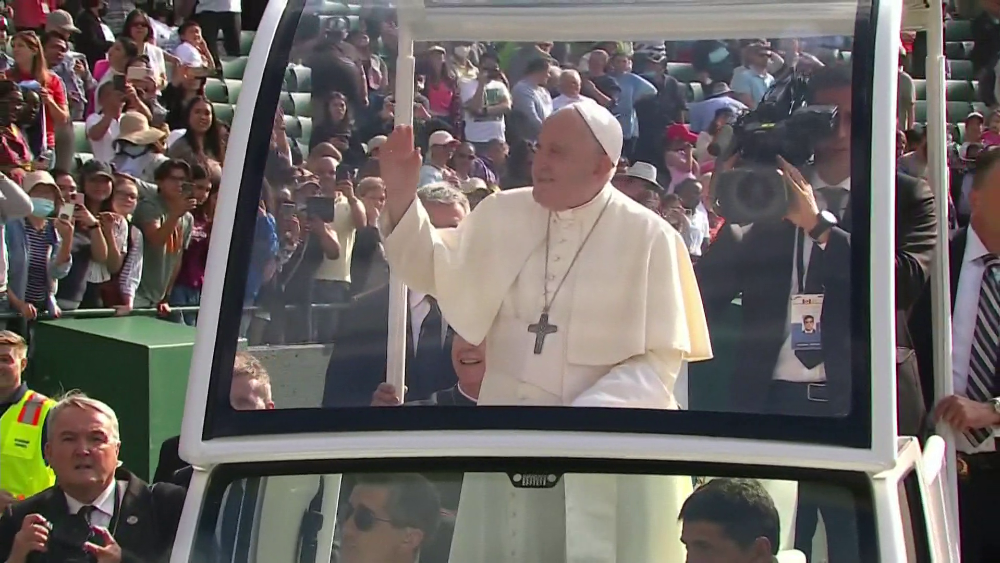 Slávenie v Edmontone sa začalo o 10.15 dopoludnia, pre nás už večer o 18.15. Svätý Otec na úvod z papamobilu pozdravil aj veriacich na susednom menšom štadióne. Podľa svojho zvyku požehnával malé deti, ktoré mu prinášali členovia ochranky. Pri svätej omši predsedal posediačky a celebrovanie pri oltári prenechal domácemu edmontonskému arcibiskupovi Mons. Richardovi W. Smithovi.
