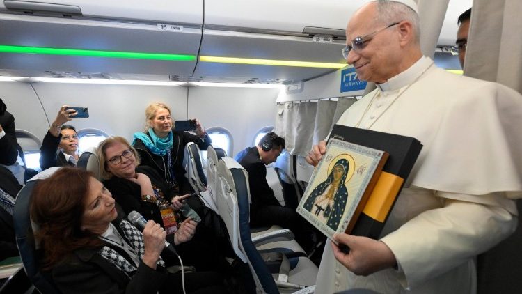 Svätého Otca v mene novinárov privítala mexická novinárka Valentina Alazraki, najskúsenejšia vatikanistka, ktorá má za sebou 163 pápežských ciest, počnúc tou v roku 1979 do Mexika s Jánom Pavlom II. „Vášmu predchodcovi pápežovi Františkovi, ktorý v Buenos Aires zdanlivo nemal rád novinárov, som pri prvej ceste povedala: Vitajte v klietke levov! Teraz ste levom vy! Vitajte!“ Novinárka darovala pápežovi byzantskú ikonu Panny Márie Guadalupskej so slovami: „Pre pápeža zo Severnej Ameriky, ale s latinskoamerickým srdcom.“