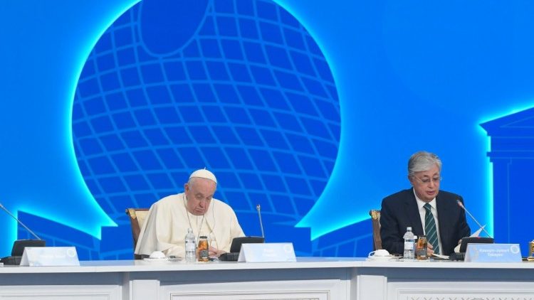 Pred skrivnostjo neskončnega, ki nas presega in privlači, nas verstva opominjajo, da smo bitja: nismo vsemogočni, ampak smo ženske in moški na poti v ista nebesa. Ustvarjenost, ki si jo delimo, tako vzpostavlja skupnost, realno bratstvo. Spominja nas, da smisla življenja ne moremo omejiti na naše osebne interese, ampak je zapisan v bratstvu, ki nas odlikuje. Rastemo le z drugimi in po zaslugi drugih. Dragi voditelji in predstavniki svetovnih in tradicionalnih verstev, nahajamo se v deželi, ki so jo skozi stoletja prečkale velike karavane: tu se je prepletlo veliko zgodb, idej, verovanj in upanj. Naj bo Kazahstan ponovno dežela srečanja med tistimi, ki so si daleč. Naj odpre novo svilno pot, ki ne bo temeljila na vrednosti trgovine, temveč na medčloveških odnosih: na spoštovanju, iskrenosti dialoga, nepogrešljivi vrednosti vsakega človeka, sodelovanju; bratska pot za skupno hojo proti miru.