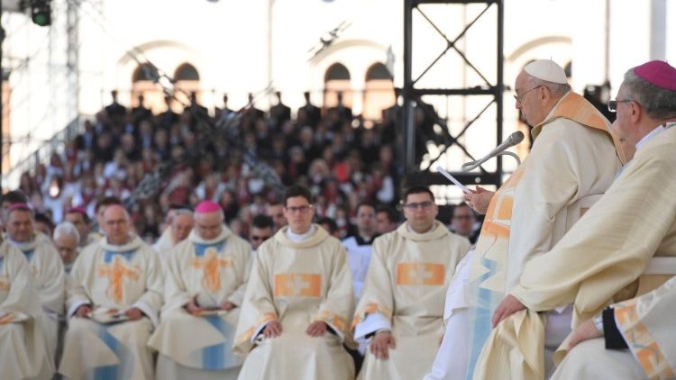 To ponavljam predvsem sebi, svojim bratom škofom in duhovnikom: nam pastirjem. Kajti pastir, pravi Jezus, ni ropar ali tat (prim. Jn 10,8); to pomeni, da ne izkorišča svoje vloge, ne zatira zaupane mu črede, ne »krade« prostora bratom laikom, ne izvaja toge oblasti. Bratje, spodbujajmo drug drugega, da bomo vedno bolj odprta vrata: »olajševalci« – to je beseda – »olajševalci« Božje milosti, strokovnjaki za bližino, pripravljeni darovati svoje življenje, tako kot nas Jezus Kristus, naš Gospod in naše vse, z odprtimi rokami uči s katedre križa in nam na oltarju vsakič znova kaže živi kruh, ki se lomi za nas. To pravim tudi našim bratom in sestram laikom, katehistom, pastoralnim delavcem, tistim s politično in družbeno odgovornostjo, tistim, ki preprosto živijo svoj vsakdan, včasih s težavo: bodite odprta vrata. Bodite odprta vrata! Dopustimo, da v naša srca vstopi Gospod življenja, njegova Beseda, ki tolaži in ozdravlja, da bi nato šli ven in mi sami postali odprta vrata v družbi. Da bi bili odprti in vključujoči drug do drugega ter bi Madžarski pomagali rasti v bratstvu, ki je pot miru.