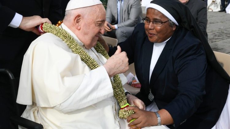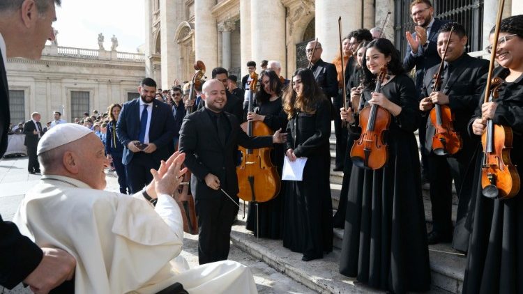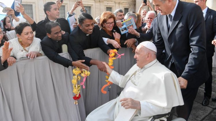 Potem ko smo se srečali z različnimi pričevalci oznanjevanja evangelija, predlagam povzetek tega cikla katehez o apostolski gorečnosti v štirih točkah, ki se navdihujejo pri apostolski spodbudi Evangelii gaudium, ki je izšla pred desetimi leti. Prva od štirih točk, ki jo bomo obravnavali danes, se nanaša na držo, od katere je odvisno bistvo evangelizacijskega delovanja: to je veselje. Krščansko sporočilo, kot smo slišali iz angelovih besed, namenjenih pastirjem, je oznanilo »velikega veselja« (Lk 2,10). Kaj je razlog zanj? Dobra novica, presenečenje, lep dogodek? Veliko več: je Oseba, Jezus. Jezus je veselje. On je Bog, ki je postal človek in je prišel med nas. Dragi bratje in sestre, vprašanje torej ni ali ga oznanjamo, ampak kako ga oznanjamo. In ta »kako« je veselje. Ali oznanjamo Jezusa z veseljem ali pa ga ne oznanjamo, kajti noben drug način oznanjevanja ne more prinesti resnične Jezusove stvarnosti.