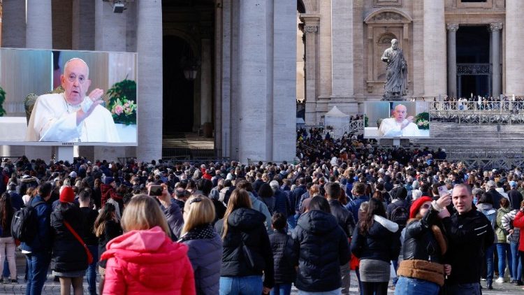 Čeprav svetega očeta ni bilo mogoče videti na oknu apostolske palače, pa so Trg svetega Petra kljub temu napolnili verniki in romarji ter mu prisluhnili in z njim molili prek zaslonov. V središču nagovora je bil Jezus kot Kralj, ki revne imenuje »bratje«, njegova »kraljevska dvorana« pa je tam, kjer nekdo trpi in potrebuje pomoč.