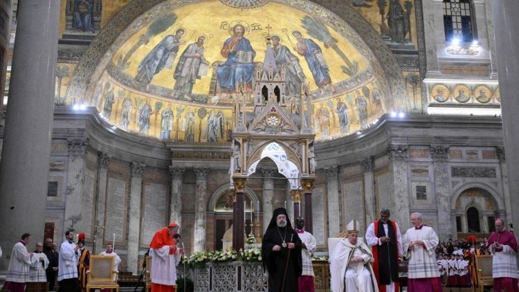Hvaležen sem metropolitu Polikarpu, ki predstavlja ekumenski patriarhat, nadškofu Ianu Ernestu, ki predstavlja anglikansko skupnost in zaključuje svoje dragoceno služenje, za katero sem mu zelo hvaležen, ter predstavnikom drugih Cerkva, ki so prisotni pri tej večerni hvalni daritvi. Pomembno je moliti skupaj in vaša navzočnost tukaj ta večer je vir veselja za vse. Prav tako pozdravljam študente, ki jih podpira Odbor za kulturno sodelovanje s pravoslavnimi Cerkvami pri Dikasteriju za pospeševanje enosti med kristjani, udeležence študijskega obiska Ekumenskega inštituta Bossey pri Ekumenskem svetu cerkva ter mnoge druge ekumenske skupine in romarje, ki so prišli v Rim na to slovesnost. Zahvaljujem se pevskemu zboru, ki ustvarja lepo molitveno vzdušje. Da bi mogel vsak izmed nas, tako kot sveti Pavel, najti svoje upanje v učlovečenem Božjem Sinu in ga ponuditi drugim: povsod tam, kjer je upanje ugasnilo, kjer so bila življenja ranjena ali so srca preplavile nesreče (prim. Homilija med odprtjem svetih vrat in sveto mašo na sveti večer, 24. december 2024).