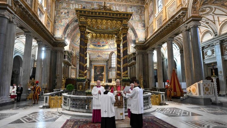 Zahvaljujem se vsem, ki delajo v tej baziliki, obema kardinaloma, ki me nocoj spremljata, in številnim osebam, ki se prispevajo k temu, da nam pomagajo živeti naše življenje molitve, pobožnosti in nam predvsem pomagajo, da se približamo Jezusovi Materi, Božji Materi, presveti Devici Mariji. To je čudovita priložnost, da obnovimo to pobožnost do Marije, Salus Populi Romani (Rešiteljica rimskega ljudstva), ki je tako pogosto spremljala rimsko ljudstvo v njegovih potrebah.