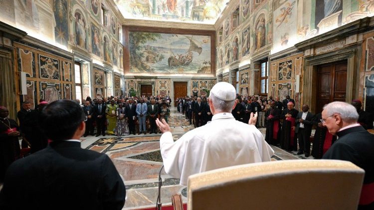 Po uvodnih pozdravih se je papež Floriberta, ki je umrl mučeniške smrti 8. julija 2007, spomnil z besedami, ki jih je papež Frančišek namenil mladim v Kinšasi med apostolskim potovanjem v Kongu: »Floribert Bwana Chui […] je bil v starosti 26 let umorjen v Gomi, ker je preprečil prehod pokvarjene hrane, ki bi ogrozila zdravje ljudi. [...] Kot kristjan je molil, mislil na druge in izbral poštenost ter rekel ne umazaniji korupcije. To pomeni ohraniti roke čiste, medtem ko se roke, ki trgujejo z denarjem, umažejo s krvjo. [...] Biti pošteni pomeni sijati podnevi, pomeni širiti Božjo luč, pomeni živeti blagor pravičnosti: premagaj húdo z dobrim!« (2. februar 2023)