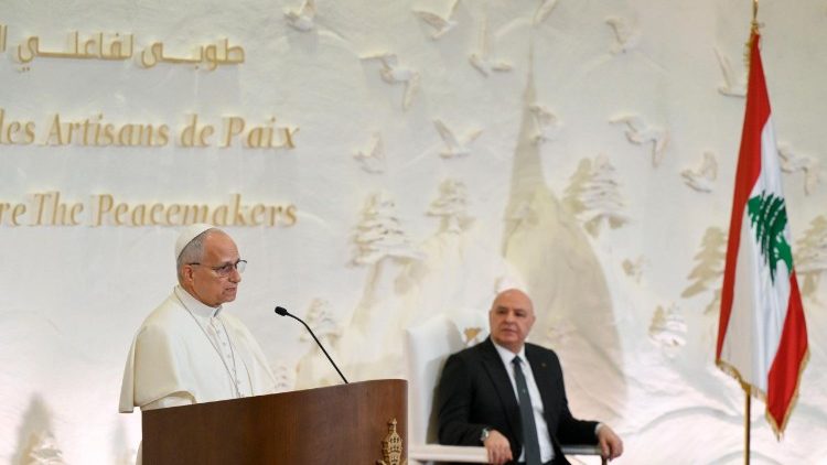 Prvi dogodek papeževega apostolskega potovanja v Libanon, kamor je iz Turčije prispel v nedeljo, 30. novembra 2025, popoldne, je bilo srečanje s predstavniki libanonske oblasti, civilne družbe in diplomatskim zborom. Spregovoril je o prizadevanju za mir v zapletenih, konfliktnih in negotovih okoliščinah ter izpostavil, da »mir pomeni znati živeti skupaj, v občestvu, kot spravljeni ljudje«.