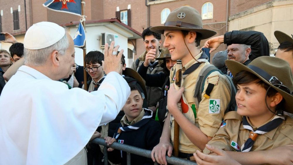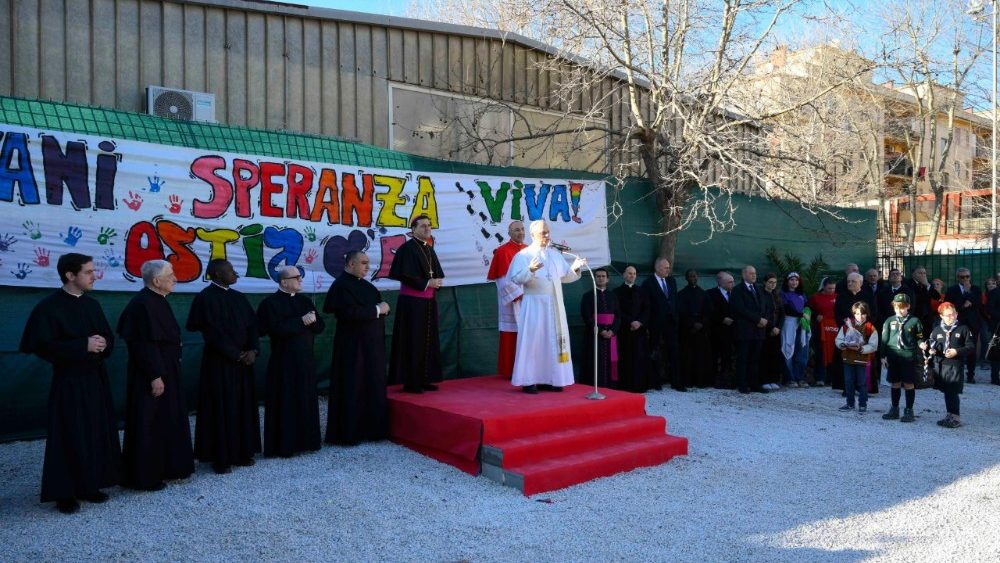 Na prostoru za cerkvijo se je sveti oče najprej srečal z otroki in mladimi iz različnih skupin in gibanj. Na začetku je izrazil svoje veselje nad tem, da obiske župnij v svoji novi škofiji začenja v Ostii; in sicer v župniji, ki nosi ime Marije Kraljice miru, ki je tako pomemben v tem času, ki ga živimo. »Župnik pravi, da naj dam besedo upanja: upanje ste vi! In prepoznati morate, da je v vašem srcu, v vašem življenju, v vaši mladosti upanje za danes in jutri. Upanje se začne že tukaj, ker Jezus hodi z nami; njegova mati Marija, Kraljica miru, vedno hodi z nami.