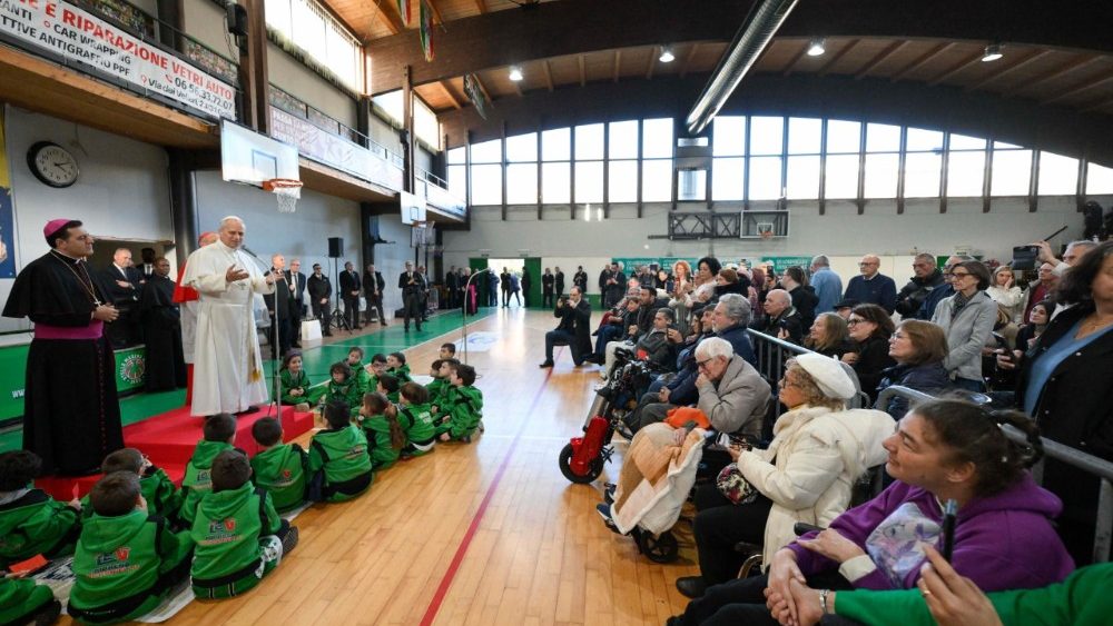 Zatem je sveti oče odšel v bližnjo športno dvorano, kjer so ga pričakali ostareli in bolni, med njimi pa so bili tudi člani lokalnega košarkarskega kluba s trenerji. Papež je najprej pozdravil nekaj bolnikov, podpisal žogo in nekaj dresov, zatem pa zbrane nagovoril. Dejal je, da mu je ob vstopu veliko ljudi reklo: »Dobrodošel!« in dodal, da se resnično čuti dobrodošlega. Zahvalil se jim je za sprejem in dejal, da je to eno izmed mnogih znamenj pristne krščanske skupnosti, »kjer se vsi učimo reči "dobrodošel", vendar ne le z besedami, ampak tudi z duhom gostoljubnosti, z odprtimi vrati in sprejemanjem vseh, ne glede na to, če so katoličani ali nekatoličani, verni ali neverni«. Zaželel je, da bi bili vedno gostoljubna skupnost.