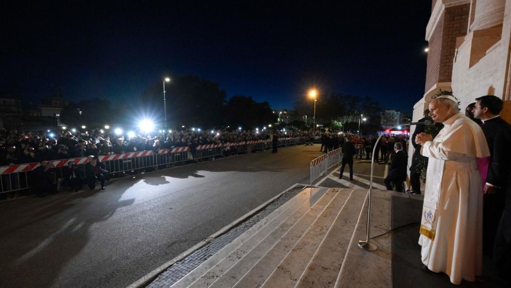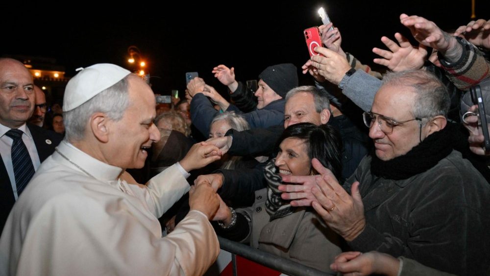 Po sveti maši pa je papež pozdravil še vernike, ki je niso mogli spremljati v cerkvi, ampak na velikem zaslonu, postavljenem ob tej priložnosti. »Dober večer vsem! Hvala, da ste tukaj. Še enkrat hvala za vaš sprejem, za ta pozdrav tudi v tem trenutku. Čez dan sonce in zdaj tema, vi pa ste vedno luč sveta. Naj vas Bog vedno blagoslavlja! V imenu Očeta in Sina in Svetega Duha. Amen. Hvala, hvala vsem!«