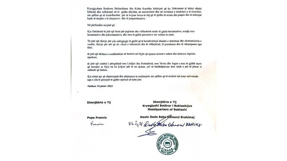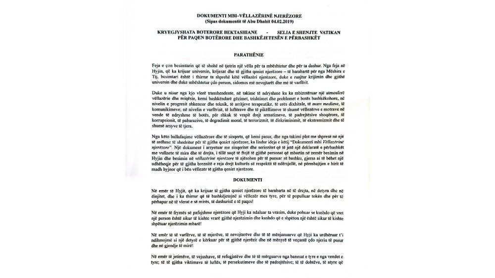 Papa Françesku dhe kreu i bektashinjve shkëmbyen dhuratat dhe nënshkruan së bashku Dokumentin e Abu Dabit për vëllazërimin njerëzor, paqen dhe bashkëjetesën në botë. Haxhi Dede Brahimaj i foli Atit të Shenjtë edhe për idenë e shtetit bektashi në Shqipëri, sipas modelit të Vatikanit, duke marrë bekimin e Papës për bashkësinë e bektashinjve dhe për gjithë popullin shqiptar. I dhuroi edhe shallin tradional të bektashinjve, të cilin Ati i Shenjtë Begoglio e vuri në qafë. Ja teksti i plotë i mesazhit të Papës Françesku…