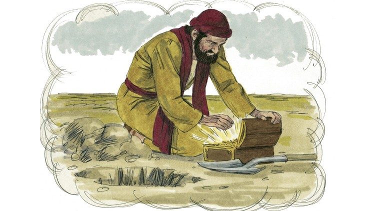 முதலாவதாக, “ஒருவர் நிலத்தில் மறைந்திருந்த புதையல் ஒன்றைக் கண்டுபிடிக்கிறார். அவர் அதை மூடி மறைத்து விட்டு மகிழ்ச்சியுடன் போய்த் தமக்குள்ள யாவற்றையும் விற்று அந்த நிலத்தை வாங்கிக்கொள்கிறார். விண்ணரசு இப்புதையலுக்கு ஒப்பாகும்” என்கின்றார் இயேசு. இன்றும் மனிதர் வாழ்வில் புதையல் என்பது வியப்புக்குரியதாகவும் விலைமதிக்க முடியாததாகவும் இருப்பதை அறிகின்றோம். புதையல் குறித்து எத்தனையோ வியப்பூட்டும் கதைகள் காணக்கிடக்கின்றன. தொல்பொருள் ஆராய்ச்சிகளின்போதெல்லாம் புதையல் குறித்து அறியவருகிறோம். எனவேதான், விண்ணரசை இந்தப் புதையலுக்கு ஒப்புமைப்படுத்துகின்றார் இயேசு. அப்படியென்றால், யார் ஒருவர் இந்தப் புதையலின் அருமையை அறிந்திருக்கிறாரோ அவர் மட்டுமே இதனை தனதாக்கிக்கொள்ள முற்படுவர் என்கின்றார் இயேசு. இதன்காரணமாகவே, “உண்மையில், என்னைப் பொறுத்தமட்டில் என் ஆண்டவராம் கிறிஸ்து இயேசுவைப் பற்றிய அறிவே நான் பெறும் ஒப்பற்றச் செல்வம். இதன் பொருட்டு மற்ற எல்லாவற்றையும் இழப்பாகக் கருதுகிறேன். அவர் பொருட்டு நான் அனைத்தையும் இழந்து விட்டேன். கிறிஸ்துவை ஆதாயமாக்கிக்கொள்ள எல்லாவற்றையும் குப்பையாகக் கருதுகிறேன்” (காண்க பிலி 3:8) என்று கூறுகின்றார் புனித பவுலடியார்.