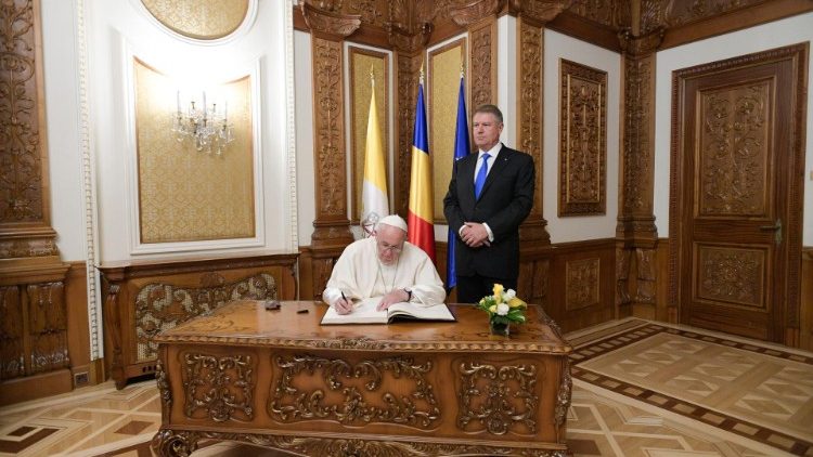 Після офіційної зустрічі в аеропорту Бухареста, Папа Франциск відбув до Президентського палацу Котрочені. При вході до комплексу відбулася офіційна церемонія привітання, після чого Святіший Отець здійснив візит ввічливості до Глави Держави Клауса Йоганніса, провів розмову з Прем’єр-міністром Віорікою Денчіле, а далі зустрівся з представниками влади, дипломатичного корпусу та громадського суспільства.