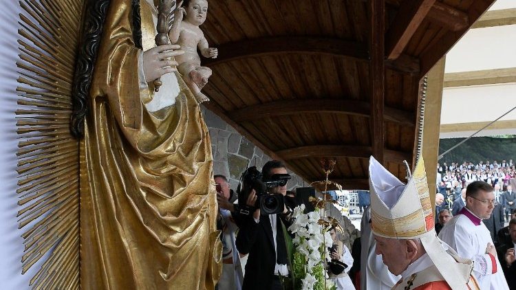 Єпископ Риму додав, що кожного року, у суботу перед урочистістю Зіслання Святого Духа, до цього санктуарію прибувають паломники, щоб віддати шану обітницям предків і зміцнити свою віру в Бога та відданість Пресвятій Богородиці, зображеній в монументальній старовинній величній дерев’яній статуї. «Це щорічне паломництво, – вів далі Святіший Отець, – належить до спадщини Трансільванії, яке, однак, одночасно віддає шану румунській та угорській релігійним традиціям; у ньому беруть участь також вірні інших конфесій, що є символом діалогу, єдності та братерства». Паломничати, за його словами, означає усвідомлювати, що як народ прямуємо до нашого дому. Народ, багатством якого є його тисячі облич, культур, мов та традицій.