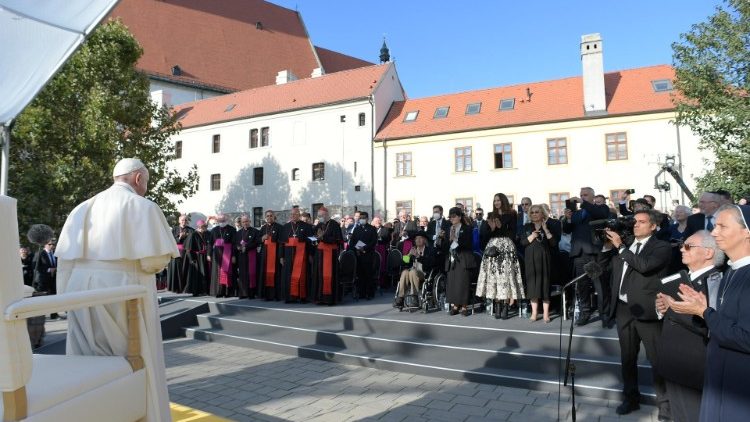 Папу Франциска, який прибув на площу після відвідин «Осередку Вифлеєм», у якому духовні доньки святої Терези з Калькутти допомагають потребуючим, зустрів Голова Центрального Союзу Єврейських Громад Словаччини, який також виголосив вітальне слово. Далі свідченнями поділилися чоловік, що пережив Голокост, і черниця зі Згромадження Сестер Урсулянок, які під час другої світової війни переховували єврейських дітей.
