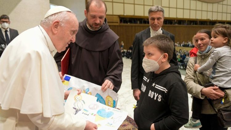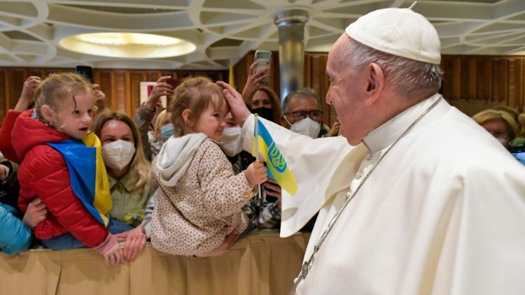 «Особливо щирі вітання скеровую до українських дітей…», – сказав Папа Франциск наприкінці загальної аудієнції в середу, 30 березня 2022 р., перерваний гучними оплесками учасників зустрічі. Ці юні паломники-біженці, що знайшли притулок в Італії, прибули на зустріч зі Святішим Отцем разом з доброчинцями, які їх приймають, в супроводі Посла України при Святому Престолі.