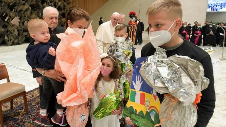 Папа вручив дітям великодні солодощі, а від них отримав малюнки та подарунки. Після того, як діти під оплески присутніх повернулися на свої місця, Папа додав: «Це важко бути викоріненими зі своєї землі через війну».