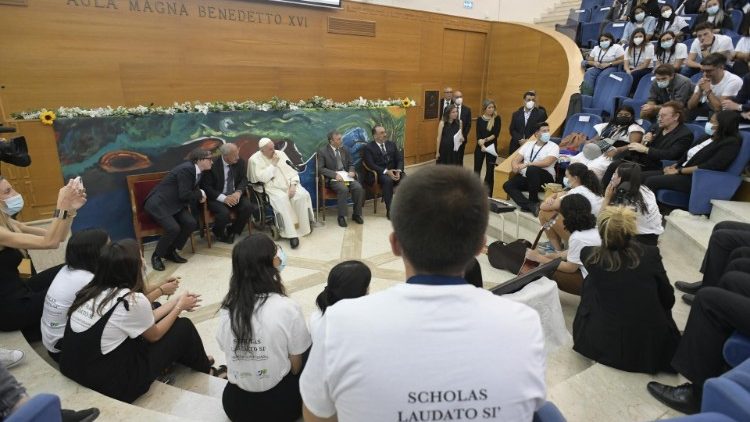 Згадана «Школа Laudato si'» згуртувала 50 юнаків і дівчат з різних країн Латинської Америки та Європи, які протягом року розроблятимуть соціально-екологічні проекти для своїх громад. Перерахувавши виклики, які сьогодні доводиться долати й подякувавши рухові «Scholas» за те, що дав їм необхідні для цього засоби, молодь сказала Папі, що ця група вирушить, щоби «звіщати Добру Новину та сказати, що ми повинні піклуватися про спільний дім».