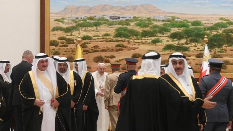 Папу Франциск зустріли Король Бахрейну Хамад ібн Іса аль-Халіфа та Наслідний Принц і Прем’єр-міністр країни Салман ібн Хамад аль-Халіфа, а також інші діти Короля та члени сім’ї. Зустріч не передбачала промов. Після віддання військових почестей та представлення делегацій відбулася коротка приватна розмова в Королівському залі, після чого всі від’їхали до розташованого всього кілька кілометрів від летовища королівського палацу.