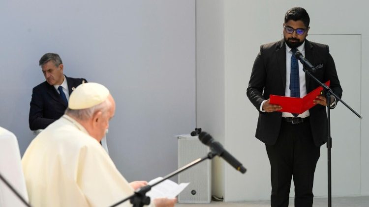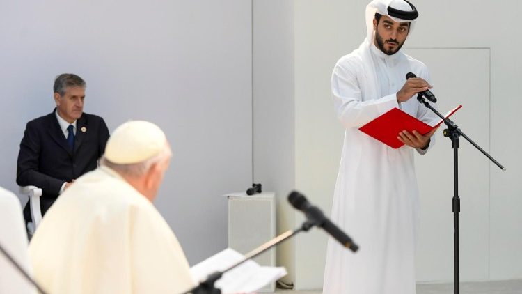 Уважно вислухавши свідчення, Папа Франциск сказав, що щасливий бачити у Королівстві Бахрейн місця зустрічі та діалогу між різними культурами та віруваннями. «І зараз, дивлячись на вас, які не є одновірцями і не боїтеся бути разом, я думаю, що без вас це співіснування різноманітностей було б неможливим. І не було б майбутнього! У тісті світу ви є доброю закваскою, якій судилося рости, долати багато соціальних і культурних бар’єрів і сприяти паросткам братерства та новизни. Саме ви, юнаки та дівчата, як невгамовні мандрівники, відкриті до безпрецедентного, не боїтеся звіритись один одному, провадити діалог, «галасувати» та змішуватися з іншими, стаючи основою дружнього та солідарного суспільства», – підкреслив Святіший Отець.