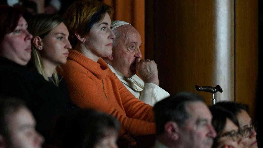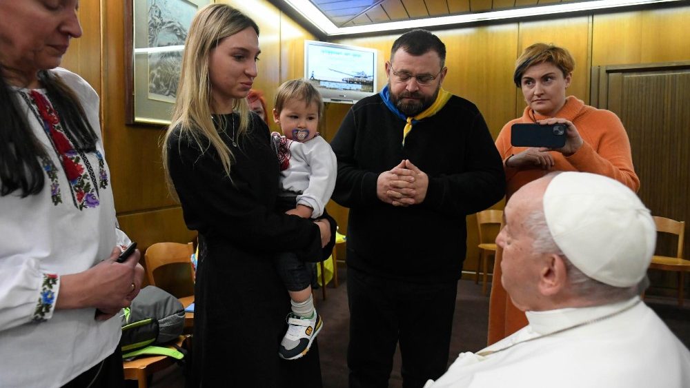 «Сьогодні вже рік цієї війни. Скеровуймо погляд до України, молімося за Україну, впустімо в наше серце біль. Ми не повинні соромитися страждати і плакати бо війна – це знищення, війна це завжди крок назад», – сказав Папа, зворушений переглядом, а тоді закликав помолитися разом, мовивши: