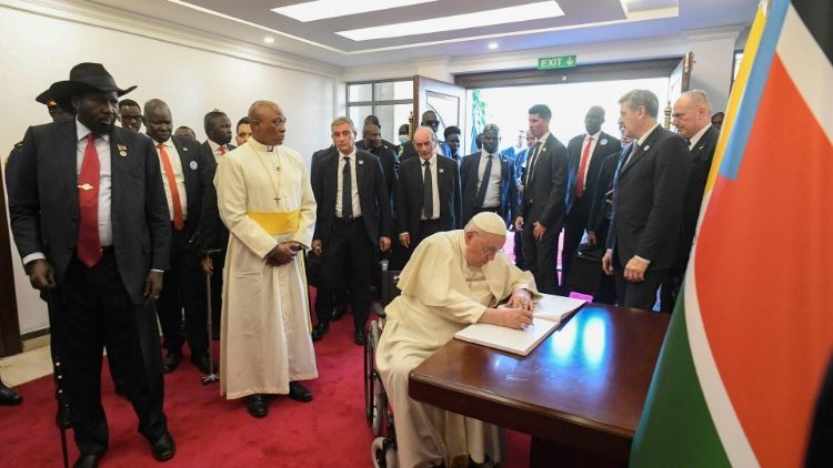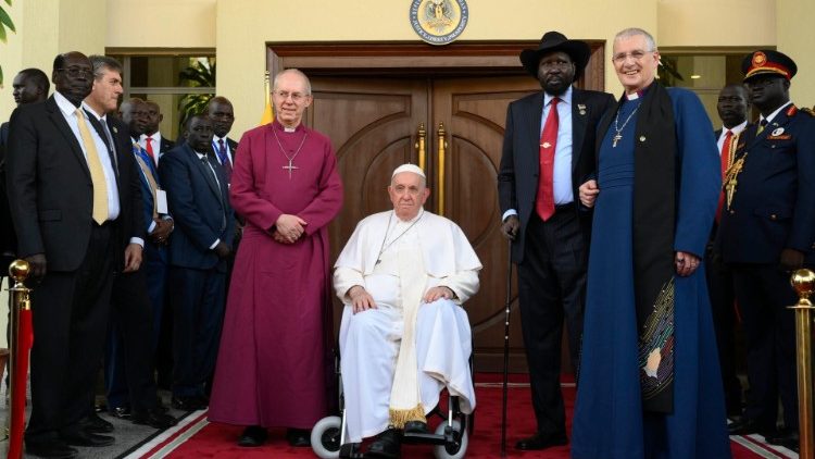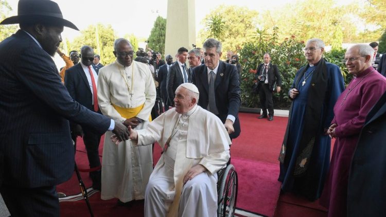 Прилетівши до Південного Судану в п’ятницю, 3 лютого 2023 р., Святіший Отець, разом зі своїми супутниками на цьому етапі подорожі – очільниками Англіканської Співдружності та Генеральної Асамблеї Церкви Шотландії, прибув до президентського палацу в Джубі, столиці Південного Судану. У той час, як Папа, в якості Глави Держави, мав приватну розмову з Президентом в рамках візиту ввічливості, у сусідньому приміщенні Віце-Президенти мали зустріч з Державним Секретарем кардиналом П’єтро Пароліном й іншими членами ватиканської делегації та з очільниками екуменічних делегацій. Згодом до них приєдналися Папа Франциск та Салва Киїр Маярдіт, Президент Південного Судану. Опісля всі вийшли на подвір’я президентського палацу, де й відбулася зустріч з представниками влади, дипломатичного корпусу, світу культури й громадянського суспільства.