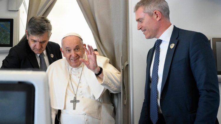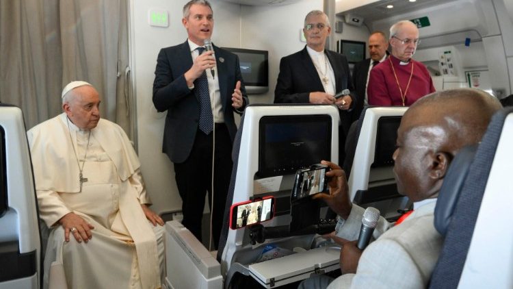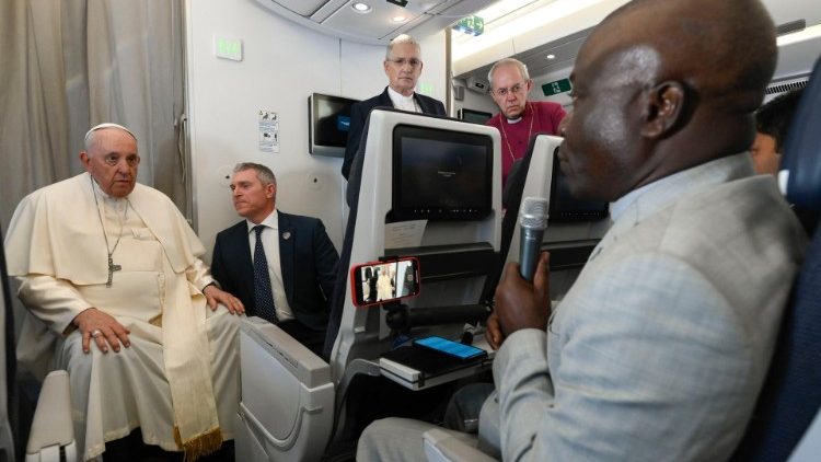 Разом зі Святішим Отцем із Джуби летіли Глава Англіканської Співдружності архиєпископ Джастін Уелбі та Модератор Загальної Асамблеї Церкви Шотландії преподобний Ієн Ґріншилдс. Вони разом взяли участь у традиційному спілкуванні з журналістами із Папського супроводу. На початку розмови Святіший Отець підкреслив, що це була екуменічна подорож, а Джастін Уелбі брав активну участь у справі примирення в Південному Судані. Тож на початку розмови Кентерберійський Архиєпископ розповів про свій досвід контактів з постраждалими від війни та зі сторонами конфлікту та про зусилля на користь примирення, які здійснювалися разом із ватиканською дипломатією, і в рамках цього навесні 2019 року відбулася відома духовна віднова політичних лідерів країни в резиденції Папи. Модератор Церкви Шотландії також розповів про зусилля своєї конфесійної спільноти.