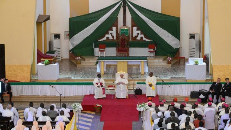 Підсумовуючи, Святіший Отець сказав, що образ Мойсея спонукає духовенство та богопосвячених осіб бути пророками, сподвижниками, заступниками, показувати своїм життям таємницю близькості Бога до Його народу, що часто може коштувати й життя. «Можемо пригадати святого Даніеля Комбоні, який разом зі своїми братами-місіонерами здійснив велику справу євангелізації на цій землі: він казав, що місіонер повинен бути готовий зробити все для Христа та Євангелія, і що існує потреба в сміливих і великодушних душах, які знають, як страждати і вмирати за Африку», – відзначив Святіший Отець. На завершення він подякував присутнім за їхнє служіння серед багатьох випробувань і труднощів, стаючи знаряддям спасіння для інших.