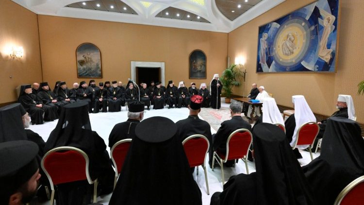 Папа Франциск уважно вислухав звернені до нього слова, висловлюючи кількома короткими репліками своє почуття близькості та співпереживання в трагедії, яку, зазнаючи жорстокості і потерпаючи від злочинів, переживають українці з «виміром мучеництва», про який недостатньо говориться. Він висловив свій смуток через відчуття безсилля перед обличчям війни, «творіння диявола, який прагне нищити», з особливою думкою про українських дітей, яких він зустрічав під час аудієнцій: «Вони дивляться на тебе і забули про усмішку», додаючи: «Це один з плодів війни: забрати в дітей усмішку».