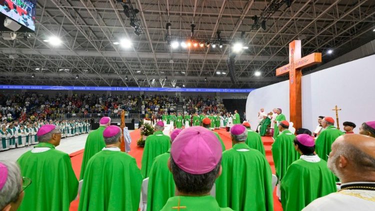 Завершенням третього дня перебування Папи Франциска у Монголії стала Свята Меса, яку він у неділю, 3 вересня 2023 р., очолив у льодовому палаці «Степова Арена». На Євхаристійне богослужіння з Наступником святого Петра зібралися місцеві католики, а також паломники із країн регіону. У своїй проповіді Святіший Отець відзначив стан людини, який характеризується, зокрема, пошуком радості та щастя, шукаючи відповідь, яка з’являється завдяки зустрічі з живим Богом.