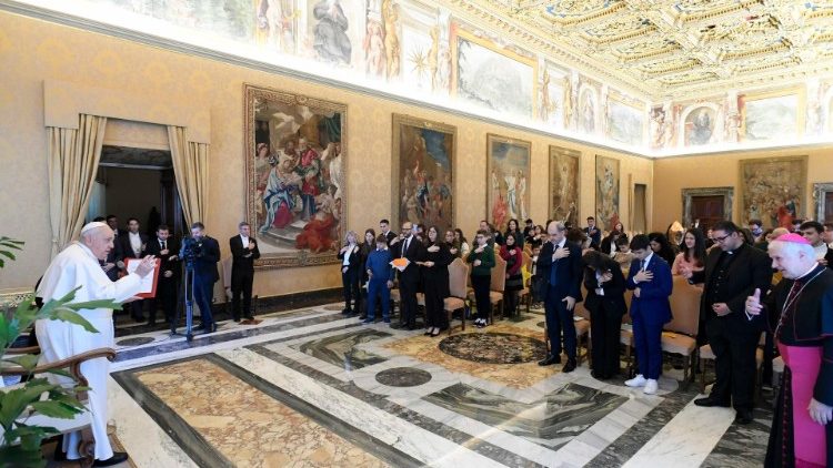 Яскраві жовті зірки як пам’ять про ровесників, які загинули через війни, що тривають у різних частинах світу. Із таким символом цього року до Папи Франциска завітали члени Дитячої Католицької Акції, щоб згідно зі звичаєм, який відтворюється в грудні кожного року, скласти йому різдвяні побажання від імені дитячого та дорослого відділів цієї організації. Приймаючи їх у п’ятницю, 15 грудня 2023 р., Святіший Отець, промовляючи експромтом, подякував їм за ентузіазм, заохочуючи не втрачати його, та віддавши приготовану промову в письмовій формі, особисто привітався з кожним із них.