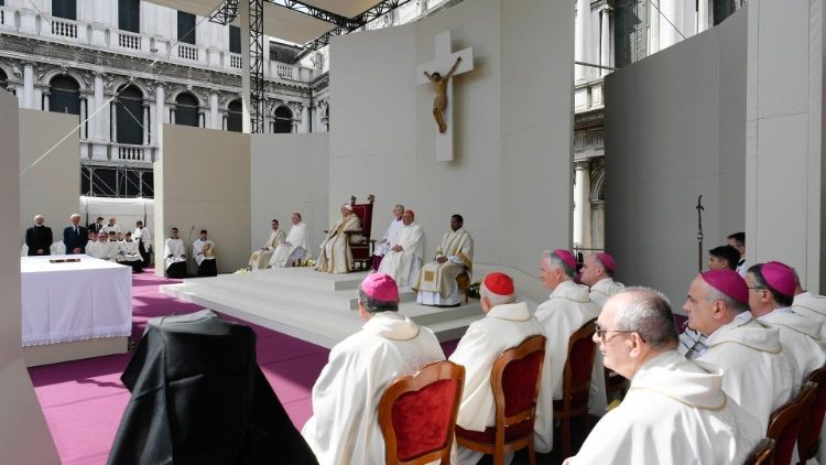 «Перебуваючи в єдності з Христом, ми зможемо принести плоди Євангелія серед дійсності, в якій живемо: плоди справедливості та миру, плоди солідарності та взаємного піклування; рішення дбати про захист екологічної спадщини, але також і людської: не забуваймо про загальнолюдську спадщину, нашу людську природу, яку Бог узяв на Себе, щоб ходити поруч з нами. Ми потребуємо, щоб наші християнські спільноти, наші квартали, наші міста ставали гостинними, доброзичливими, інклюзивними місцями. А Венеція, яка завжди була місцем зустрічі та культурного обміну, покликана бути знаком краси, доступної для всіх, починаючи з останніх, знаком братерства і піклування про наш спільний дім», – наголосив Святіший Отець.