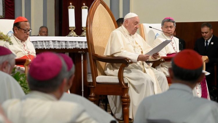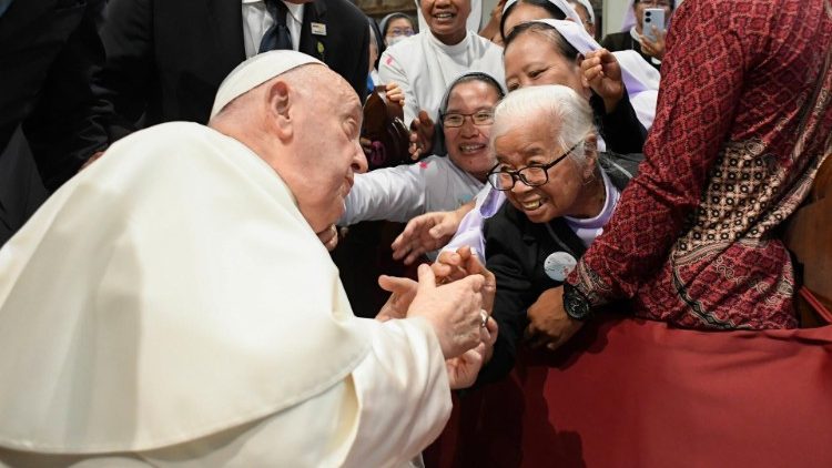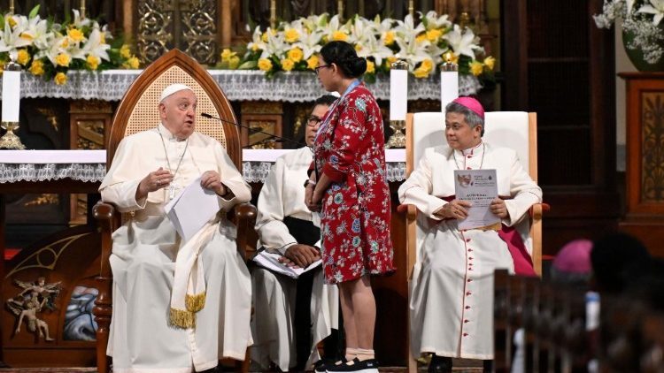 Після обіду, 4 вересня 2024 р., Папа Франциск зустрівся в катедральному соборі Внебовзяття Пресвятої Богородиці у Джакарті з єпископами, священиками, дияконами, богопосвяченими особами, семінаристами та душпастирськими співпрацівниками. Промовляючи після привітання Голови єпископської конференції Індонезії та свідчень священників, черниці та катехитів, Святіший Отець зосередився на особливостях віри, братерства та співчуття, які виражають шлях Церкви у Індонезії.