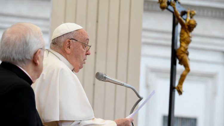 Відтак Папа поділився, що цими днями отримав лист від студента з України, який просив бути свідком віри українського народу. Наступник святого Петра зачитав цей лист: «Святіший Отче, коли в середу ви згадуватимете мою країну і матимете нагоду промовляти до всього світу в тисячний день цієї жахливої війни, будь ласка, не згадуйте лише про наші страждання, але будьте свідком також нашої віри: навіть якщо вона недосконала, її цінність не зменшується, вона болючими пензлями малює картину воскреслого Христа. У ці дні в моєму житті було занадто багато смертей. Жити в місті, де одна ракета вбиває і завдає поранень десяткам мирних жителів, бачити стільки сліз – це важко, – пише український студент. – Я хотів би втекти, хотів би повернутися в дитинство, коли мене обіймала мама, я чесно хотів би побути в тиші й любові, але я дякую Богові, тому що через цей біль я вчуся більше любити. Біль – це не лише шлях до гніву та розпачу; якщо він ґрунтується на вірі, то є добрим учителем любові. Святіший Отче, якщо біль є нестерпним, це означає, що ти любиш, тому, коли ви будете розповідати про наш біль, коли ви згадуватимете про тисячу днів страждань, згадайте також про тисячі днів любові, бо тільки любов, віра і надія надають ранам справжнього сенсу».