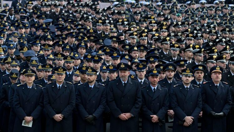Папа привітав представників збройних сил, поліції, сил безпеки та капеланів, закликавши їх вчитися від Ісуса «мати уважний погляд, здатний вловити загрози для спільного блага», небезпеки й ризики, які нависають над життям громадян», не лише бачити зло, щоб його викривати, «але й сісти на бурхливий човен і намагатися зробити так, щоб він не сів на мілину, виконуючи місію служіння добру, свободі та справедливості». «Ваша присутність у наших містах і місцевостях, ваше постійне перебування на боці законності та на боці найслабших стає уроком для всіх нас: вчить нас, що добро може перемогти, незважаючи ні на що, вчить нас, що справедливість, законність і громадянська відданість є необхідними цінностями і сьогодні, вона навчає нас, що ми можемо творити людяніший, справедливіший і братерський світ, незважаючи на протистояння сил зла», – підкреслив Святіший Отець.