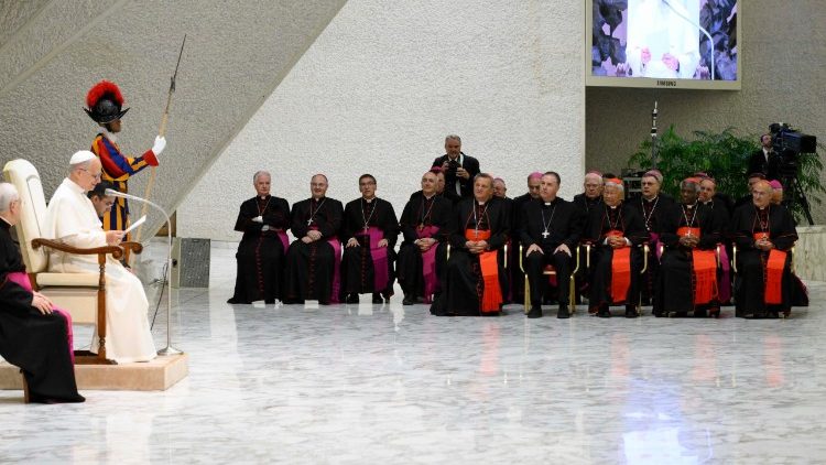 На початку Святіший Отець поділився, що він сам лише два роки тому переїхав з Перу для праці в Римській курії, отримавши призначення від Папи Франциска. За його словами, Папи відходять, а Курія залишається, а тому зазначив, що працювати в Римській курії, й аналогічно в структурах Держави-Міста Ватикану, означає допомагати зберігати пам’ять про Апостольську Столицю, «щоб служіння Папи здійснювалось щонайкраще». «Курія – це інституція, яка зберігає і передає історичну пам’ять Церкви, про служіння її єпископів. Це дуже важливо. Пам’ять є суттєвим елементом живого організму. Вона не лише спрямована в минуле, але й живить теперішнє та скеровує майбутнє. Без пам’яті губиться шлях, втрачається відчуття напрямку», – зауважив Папа Лев XIV.