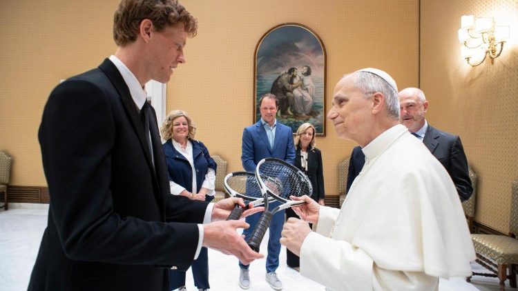 У середу, 14 травня 2025 р., Папа Лев XIV зустрівся у кабінеті при залі Павла VI у Ватикані з першою рекеткою світу італійським тенісистом Янніком Сіннером. У короткій зустрічі, що складалася з привітань, короткого діалогу та обміну подарунками, взяли участь також батьки атлета Ганспетер і Сіґлінда та президент Італійської федерації тенісу і паделю Анджело Бінаґі, який вручив Папі почесний членський квиток з його ім'ям.