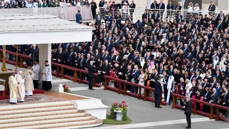 У богослужінні взяли участь приблизно 200 тисяч вірних, між якими також були паломники, що прибули з нагоди Ювілею церковних братств. Понад 150 офіційних делегацій представляли міжнародну спільноту, чимало країн були представлені на найвищому рівні, зокрема, Україну представляв Президент Володимир Зеленський. Були присутні екуменічні делегації, деякі очолювані предстоятелями, зокрема, були присутні Вселенський патріарх Вартоломей І та Єрусалимський патріарх Теофіл ІІІ. Не бракувало представників інших релігій, зокрема, юдаїзму, ісламу, індуїзму, буддизму, сикхізму, зорооасризму та джайнізму.
