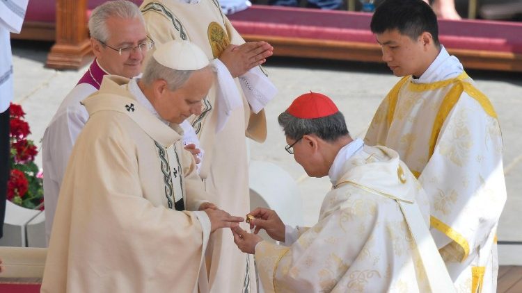 Після читань зі Святого Письма відбувся обряд накладення паллія та вручення «Перстня рибалки». Кардинал Маріо Дзенарі, представник кардиналів-дияконів, а також європейського континенту та Близького Сходу, проказав молитву й наклав на плечі Святішого Отця паллій. Опісля кардинал Фрідолін Амбонґо Бесунґу, представник кардиналів-пресвітерів та африканського континенту, проказав спеціальну молитву, призиваючи особливу Господню допомогу для Наступника святого Петра. Врешті, кардинал Луїс Антоніо Таґле, представляючи кардиналів-єпископів та азійський континент, вручив Папі перстень-печатку, що є символом його влади.
