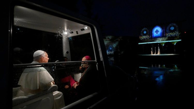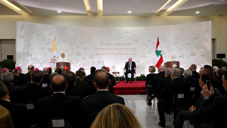 «Блаженні миротворці», – це євангельське блаженство є гаслом візиту Папи Лева XIV в Ліван, і навколо цієї теми оберталася його перша промова в Країні кедрів, яку він у неділю, 30 листопада 2025 р., виголосив під час зустрічі з представниками влади, дипломатичного корпусу та громадянського суспільства. Зустріч відбулася в президентському палаці, під час переїзду до якого з аеропорту Папа частину дороги проїхав панорамним автомобілем. Незважаючи на рясну зливу, що обрушилася на ліванську столицю, місцеві мешканці вздовж дороги вітали гостя з великим ентузіазмом. У офіційній резиденції відбувся візит ввічливості до Глави Держави, а також зустрічі з очільниками уряду й парламенту.