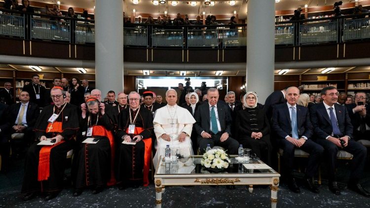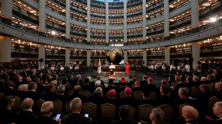 Промовляючи після Глави Держави, Лев XIV подякував за сердечний прийом, зауваживши, що радіє з нагоди розпочати Апостольські подорожі свого понтифікату з цієї землі, пов’язаної з початками християнства. «Природна краса вашої країни спонукає нас берегти Боже створіння. Ба більше, культурне, мистецьке та духовне багатство місць, де ви живете, нагадує нам, що в зустрічі різних поколінь, традицій та ідей формуються великі цивілізації, в яких розвиток і мудрість укладаються в єдність», – сказав він, погоджуючись з тим, що наш світ має за собою століття конфліктів, і досі дестабілізований «амбіціями та рішеннями, що топчуть справедливість і мир». У цьому контексті Папа вказав на символічне значення моста через Дарданелли, що вказує на покликання об’єднувати, починаючи зсередини. «Суспільство є живим, якщо воно є плюралістичним: саме мости між його різними душами роблять його громадянським суспільством», – сказав він, запевняючи у тому, що й християни Туреччини мають намір робити свій позитивний внесок у єдність країни.