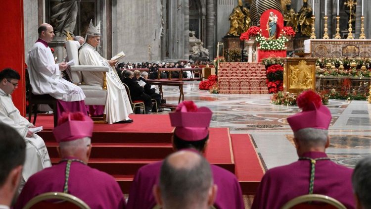 Як зазначив Святіший Отець на початку проповіді, літургія цієї вечірні урочистості Пресвятої Богородиці Марії розповідає про приголомшливе таїнство: про те, що Бог народжується від діви, або ж про богоматеринство Марії. Крім того, ця урочистість, яка завершує Октаву Різдва, припадає на перехід від одного року до іншого, проливаючи на нього благословення «Того, хто був, є і приходить». «Ба більше, сьогодні ми святкуємо її наприкінці Ювілею, в серці Риму, при гробі святого Петра, а тому подячна пісня “Te Deum”, яка незадовго прозвучить в цій базиліці, прагне поширюватись, щоб стати голосом усіх сердець і обличь, які пройшли під цими склепіннями та вулицями цього міста», – сказав він.