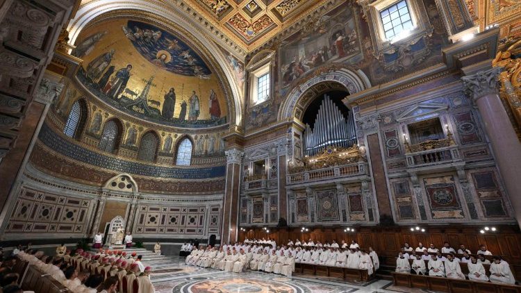 У Великий Четвер Церква вшановує встановлення таїнств Євхаристії та Священства. Внутрішній зв’язок між цими двома таїнствами, як нагадав Папа, виражає досконале дарування Ісуса, Верховного Священника, та Євхаристії, живої навіки. У єпископах та священниках, настановлених «священниками Нового Завіту» згідно з заповіддю Господа, присутній знак Його любові до всього Божого народу, якому вони покликані служити всім своїм єством. «Великий Четвер – це день щирої вдячності та справжнього братерства. Нехай сьогоднішня вечірня Євхаристійна адорація в кожній парафії та спільноті стане часом роздумів над жестом Ісуса – коли ми, як і Він, стаємо на коліна і просимо сили, щоб наслідувати Його у служінні з такою самою любов’ю», – підсумував Лев XIV.
