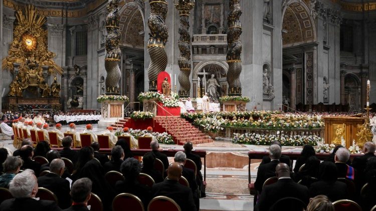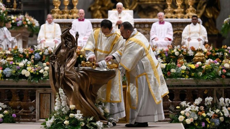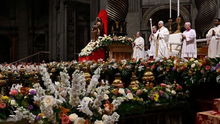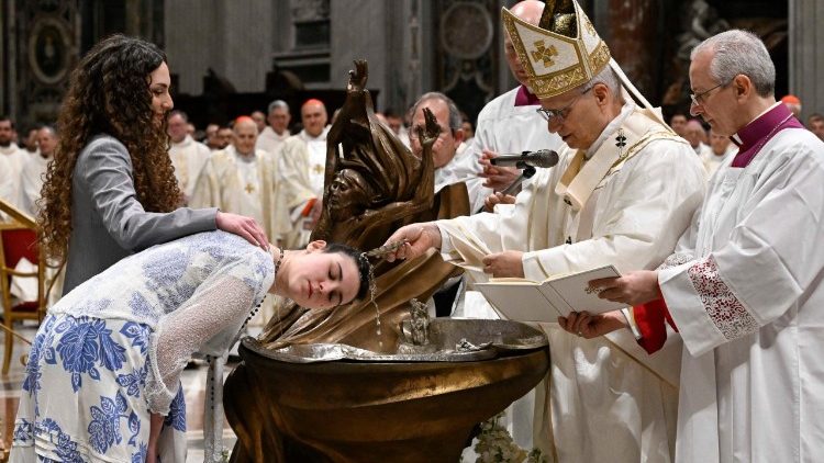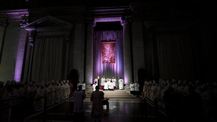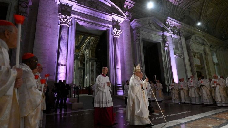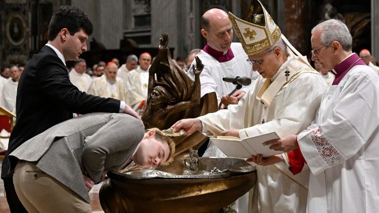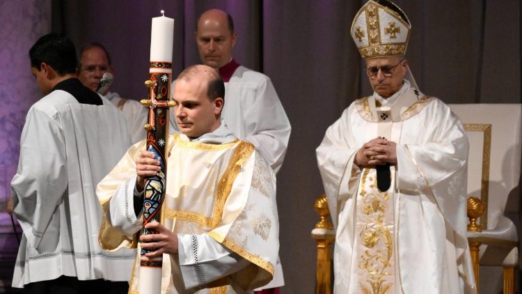 Так, дорогі браття й сестри, на початку цього богослужіння диякон возвеличив світло Воскреслого Христа, яке символізує Пасхальна свічка. Від цієї єдиної свічки ми всі запалили свої світильники і освітили цю величну базиліку, кожен несучи полум’я, взяте з того самого вогню. Це знак пасхального світла, яке єднає нас у Церкві як світильники для світу. На сповіщення диякона ми відповіли «амінь», підтверджуючи наше зобов’язання прийняти цю місію, і незабаром ми повторимо наше «так», поновлюючи хрещальні обітниці.
