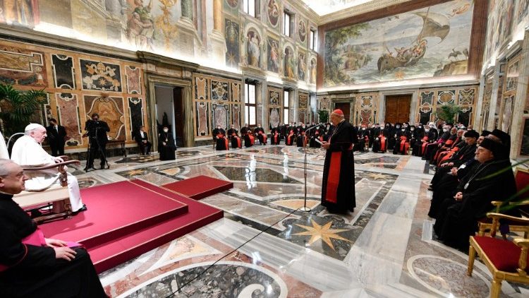 У п’ятницю, 18 лютого 2022 р., Папа Франциск прийняв на аудієнції учасників пленарної асамблеї Конгрегації Східних Церков. Найбільшою з-поміж Східних Католицьких Церков є Українська Греко-католицька Церква, а в ці дні увага світу з тривогою прикута до подій, що відбуваються в Україні та навколо її кордонів. З огляду на це кардинал Леонардо Сандрі, Префект Конгрегації Східних Церков, промовляючи до Святішого Отця на початку зустрічі, зазначив, що між учасниками асамблеї очолюваного ним відомства зродилося «бажання вкласти» у руки Святішого Отця «спільний заклик, який приєднується до тих», з якими Папа протягом цих тижнів «неодноразово звертався через загострення ситуації в Україні та на її кордонах».