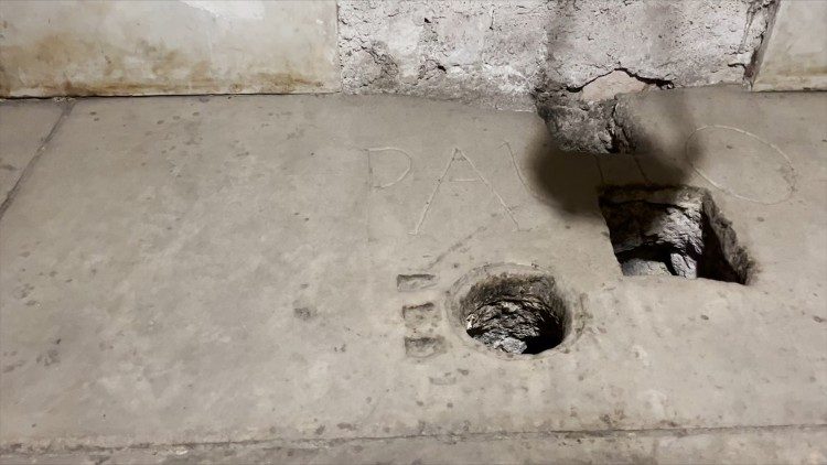 Біля підніжжя вівтаря, під чудовим киворієм, виготовленим у 1285 році відомим скульптором Арнольфо ді Камбіо, видніються камені саркофагу, виявлені дослідниками у 2006 році. Вдень і вночі безперервно горить пломінь, що вказує на сакральність цього місця. Поруч стоїть бронзова та скляна урна з ланцюгом з римського ув'язнення апостола, що зберігається в базиліці від IV століття. Крізь решітку можна побачити нижче рівня землі мармурову плиту, складену з двох частин: вона має розміри 2,12 х 1,27 метра. На ній викарбувано напис PAULO APOSTOLO MART і є три отвори: один круглий і два квадратних. Вона датується IV-V століттями і свідчить про культ, який був на цьому місці від самого початку, ще до того, як тут збудували храм. Отвори мали функцію отримання контактних реліквій, тобто смужок тканини, які вводили до тих пір, поки вони не торкалися поховання.