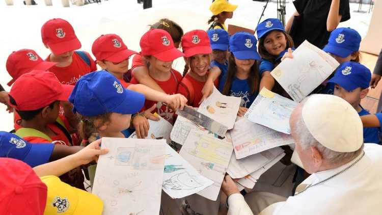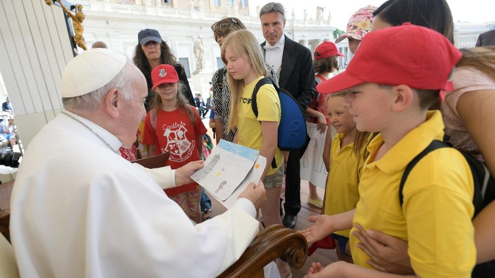 Тепер же українські діти разом з новими італьськими друзями прибули до Папи Франциска, якому принесли свої малюнки, які були приготовані під час занять у літньому таборі.