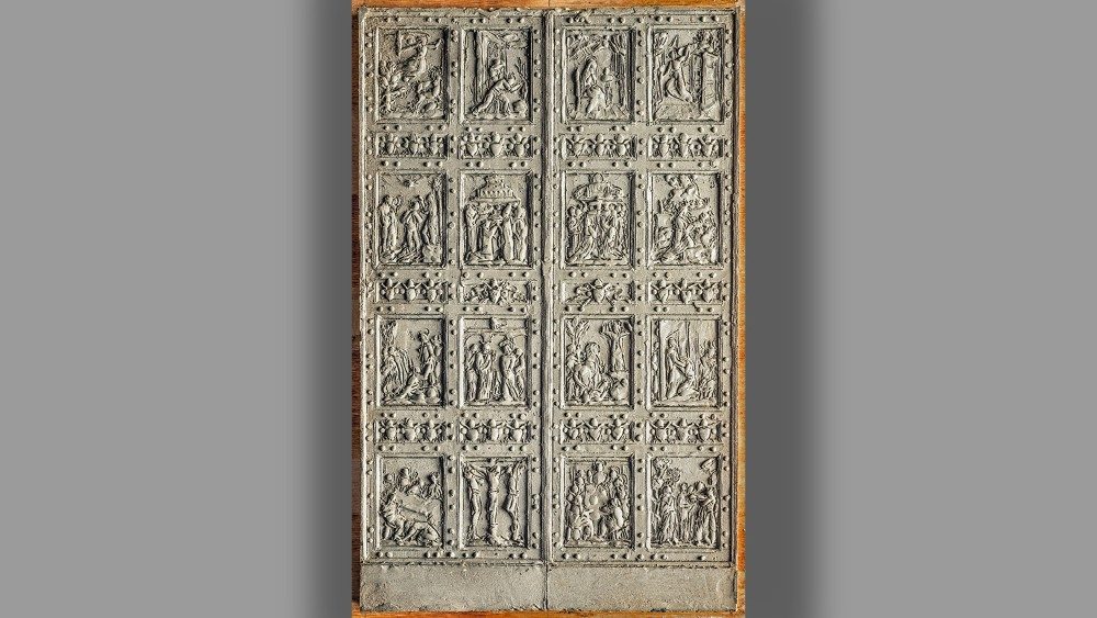 圣伯多禄大殿圣门上共有16个浮雕画,分成四行四列,由上到下带出四层意义,描绘出人如何犯罪,却又如何因著天主的慈悲而获得救赎: